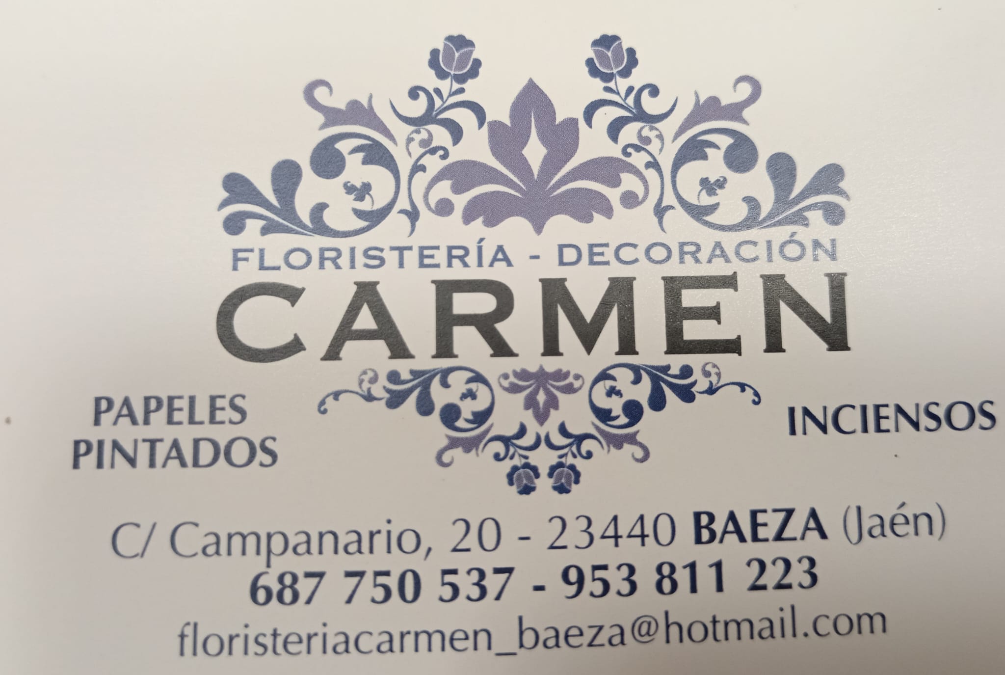 C. Campanario, 20, 23440 Baeza, Jaén floristeriacarmen_baeza@hotmail.com Teléfono: 667.8568.33//687750537 Horario: jueves 10:00–13:30, 18:00–20:30 viernes 10:00–13:30, 18:00–20:30 sábado 10:00–13:30 domingo Cerrado lunes 10:00–13:30, 18:00–20:30 martes 10:00–13:30, 18:00–20:30 miércoles 10:00–13:30, 18:00–20:3 https://floristeriacarmen.es/